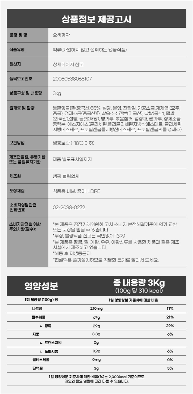 | 1-6. 원재료명 (「농수산물의 원산지 표시 등에 관한 법률」에 따른 원산지 표시 포함) 및 함량(원재료 함량 표시대상 식품에 한함) | 상품 상세페이지 참조 |