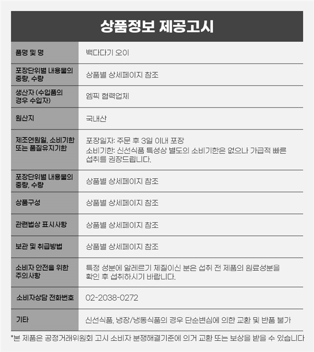 | 9. 소비자 안전을 위한 주의사항 (「식품 등의 표시ㆍ광고에 관한 법률 시행규칙」 제5조 및 [별표 2]에 따른 표시사항을 말함) | 상품 상세페이지 참조 |