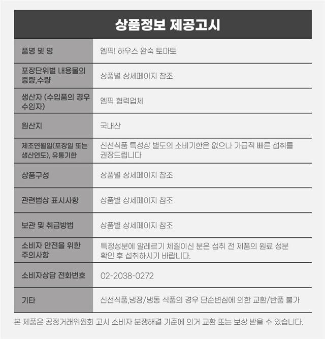 | 5. 제조연월일, 소비기한 또는 품질유지기한 | 신선식품 특성상 별도의 소비기한은 없으나 가급적 빠른 섭취를 권장 드립니다. |
