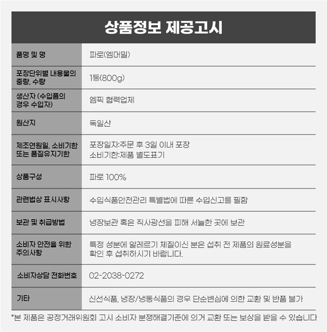 | 9. 소비자 안전을 위한 주의사항 (「식품 등의 표시ㆍ광고에 관한 법률 시행규칙」 제5조 및 [별표 2]에 따른 표시사항을 말함) | 상품 상세페이지 참조 |