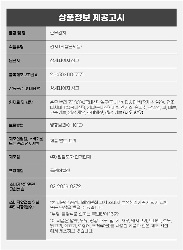| 1. 「식품 등의 표시ㆍ광고에 관한 법률」 및 「식품등의 표시기준」에 따른 표시사항 | 상품 상세페이지 참조 |