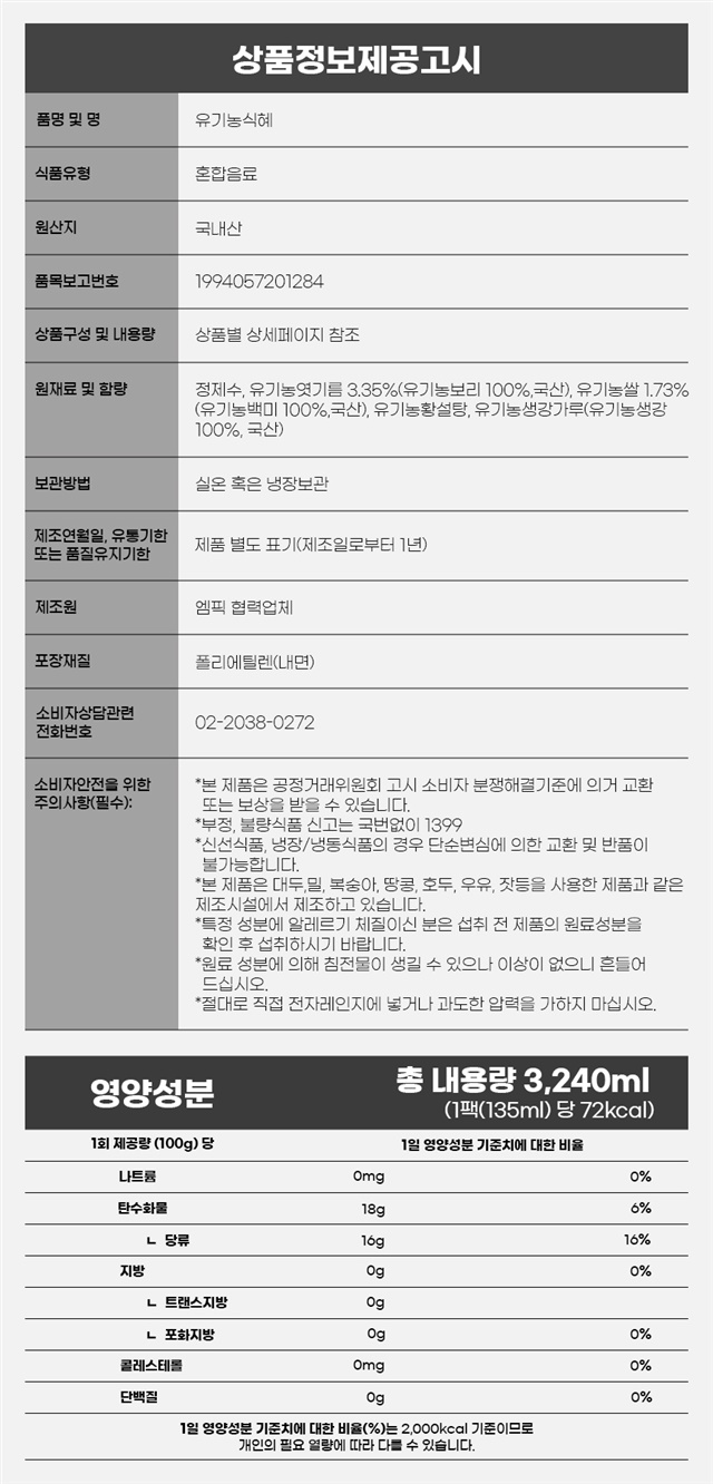 국내산 유기농 쌀과 엿기름으로 빚어낸 맑은 식혜