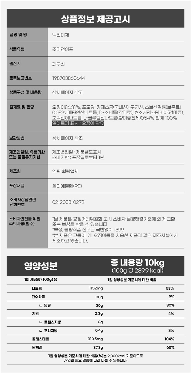 | 9. 소비자 안전을 위한 주의사항 (「식품 등의 표시ㆍ광고에 관한 법률 시행규칙」 제5조 및 [별표 2]에 따른 표시사항을 말함) | 상품 상세페이지 참조 |