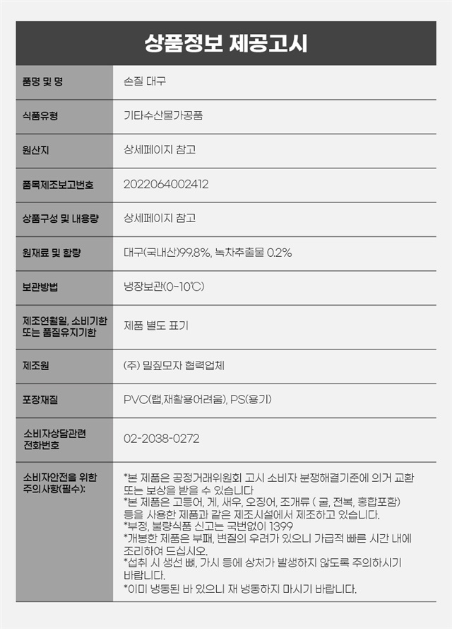 | 9. 소비자 안전을 위한 주의사항 (「식품 등의 표시ㆍ광고에 관한 법률 시행규칙」 제5조 및 [별표 2]에 따른 표시사항을 말함) | 상품 상세페이지 참조 |