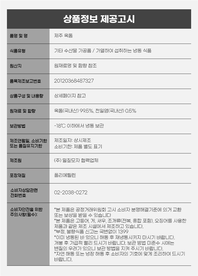 | 9. 소비자 안전을 위한 주의사항 (「식품 등의 표시ㆍ광고에 관한 법률 시행규칙」 제5조 및 [별표 2]에 따른 표시사항을 말함) | 상품 상세페이지 참조 |
