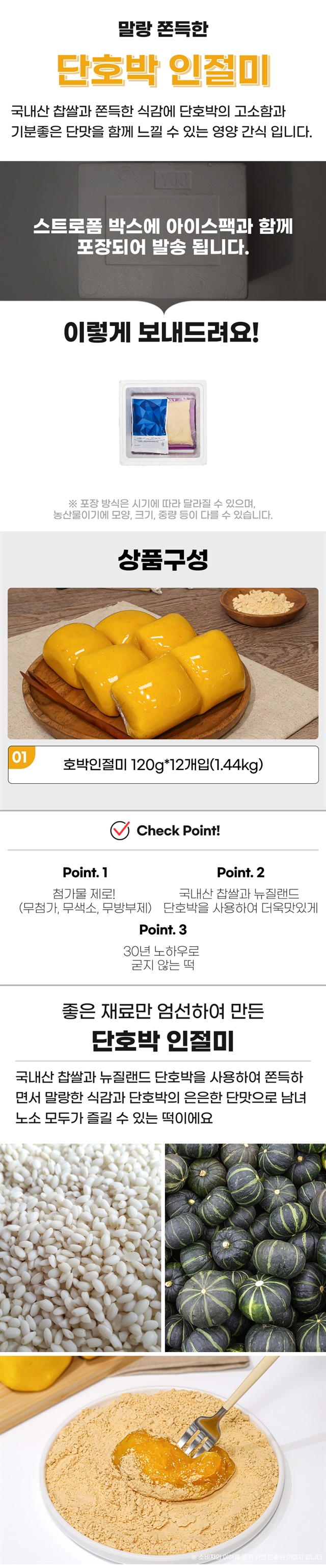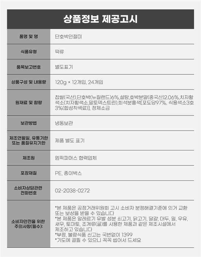 1-1. 제품명 | 국산 찹쌀로 만들어 더욱 쫀득하며 말랑한 단호박 인절미 12개 |