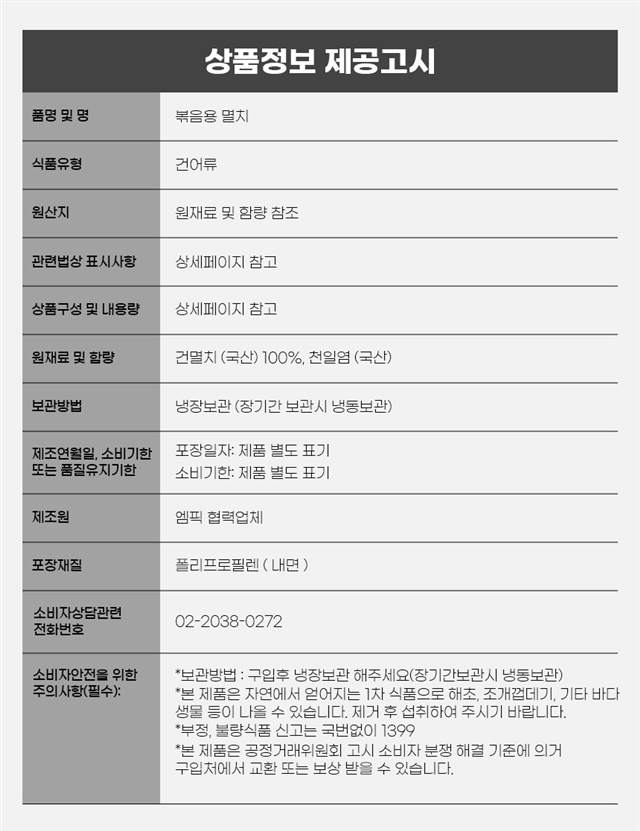 | 9. 소비자 안전을 위한 주의사항 (「식품 등의 표시ㆍ광고에 관한 법률 시행규칙」 제5조 및 [별표 2]에 따른 표시사항을 말함) | 상품 상세페이지 참조 |