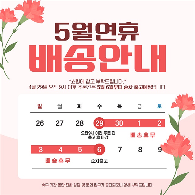 · 배송은 입금확인된 날짜로부터 1~3일 소요되며 최대 7일 이내 출고됩니다. ( 공휴일, 기상악화 등 불가피한 상황에 따라 추가 지연될 수 있습니다.)