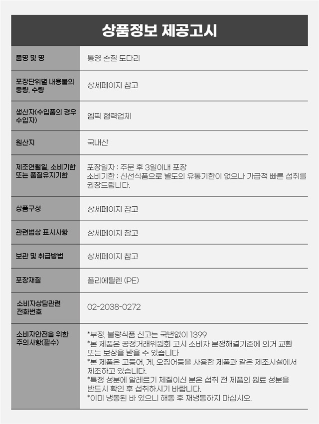 | 9. 소비자 안전을 위한 주의사항 (「식품 등의 표시ㆍ광고에 관한 법률 시행규칙」 제5조 및 [별표 2]에 따른 표시사항을 말함) | 상세페이지 참조 |